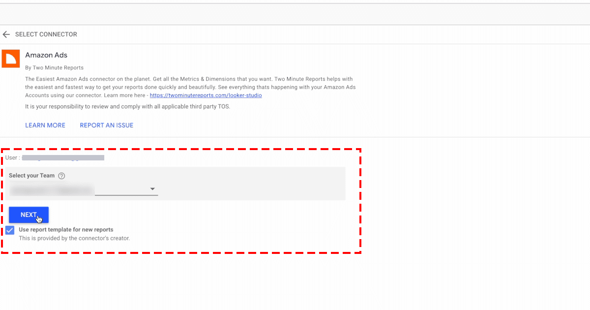 - Once redirected to Looker Studio, choose the relevant team and check the box next to “Use report template for new reports”. Click Next to continue.