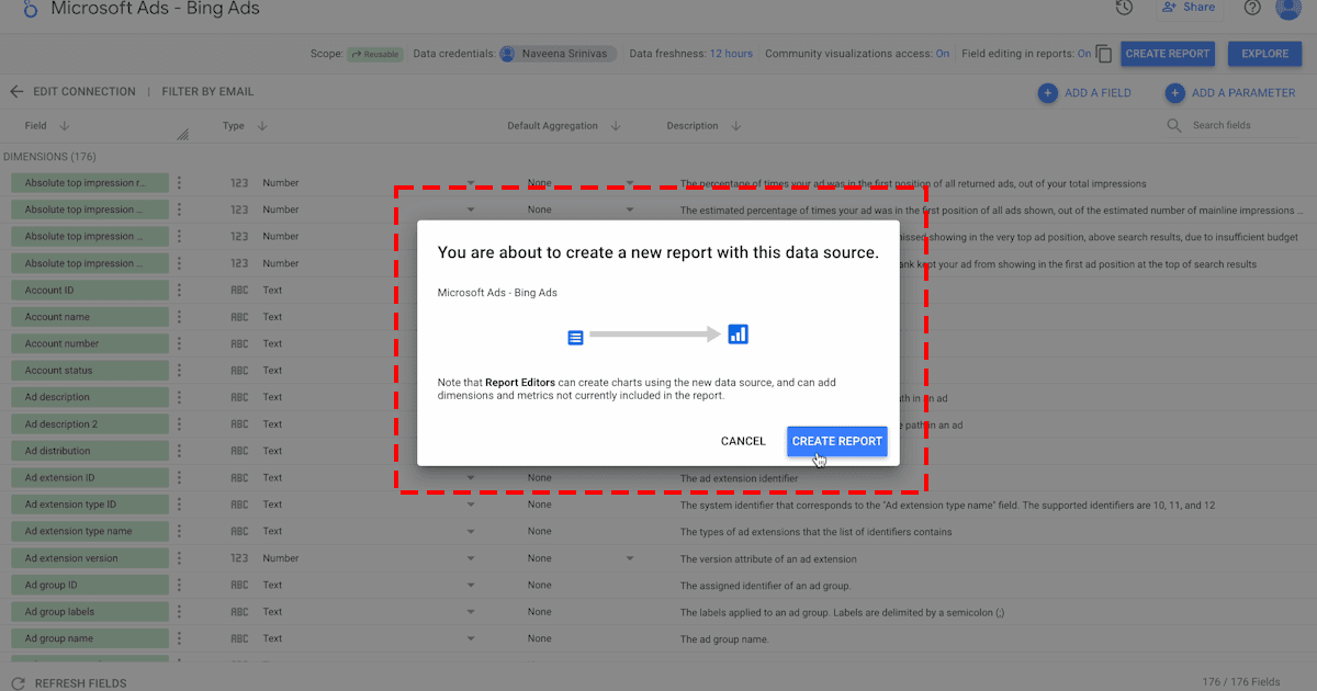- After adding the data source and configuring the queries, click the green “Create Report” button to open the “Creating New Data Studio Report” window.