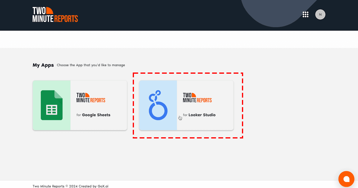 - Once logged in, choose Two Minute Reports for Looker Studio from the My Apps page.