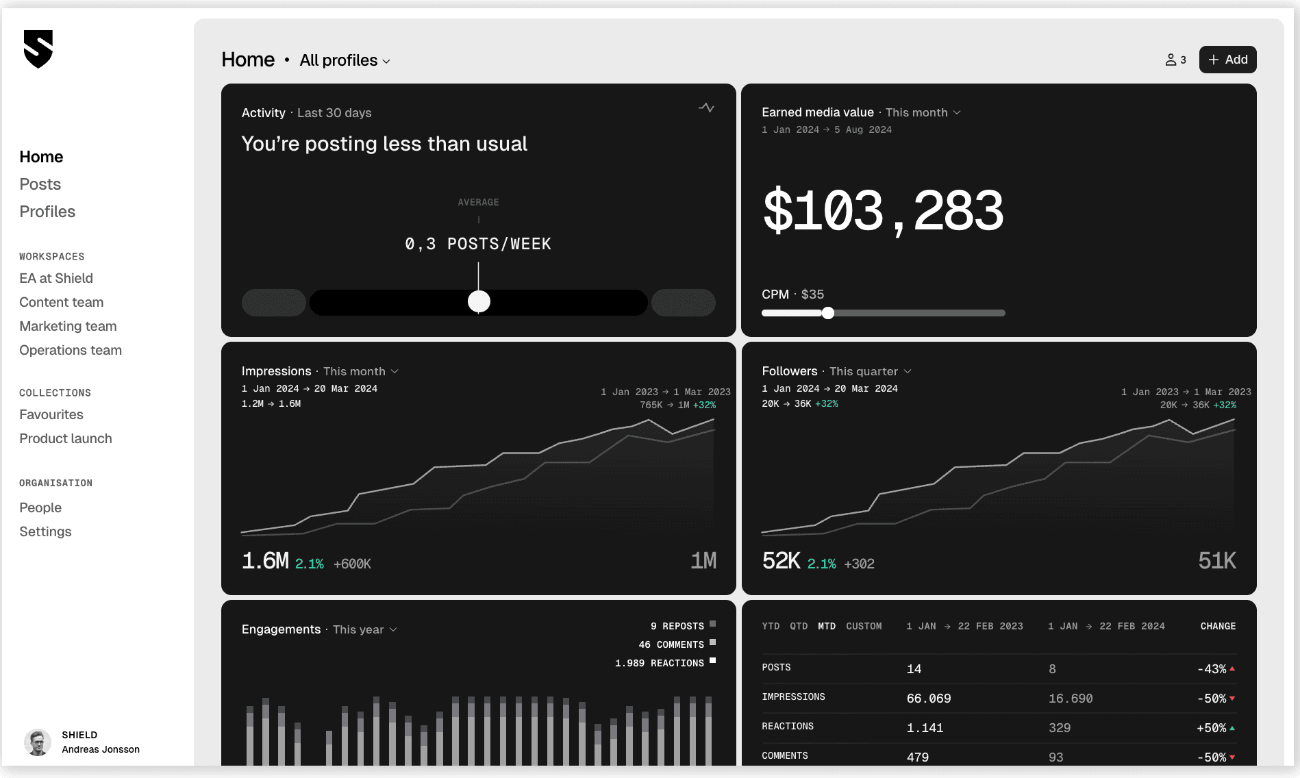Shield Analytics is a LinkedIn analytics tool built specifically for agencies and teams focused on growing personal brands. It provides detailed insights into post and profile performance, helping you understand which content resonates, what drives engagement, and where you can improve.