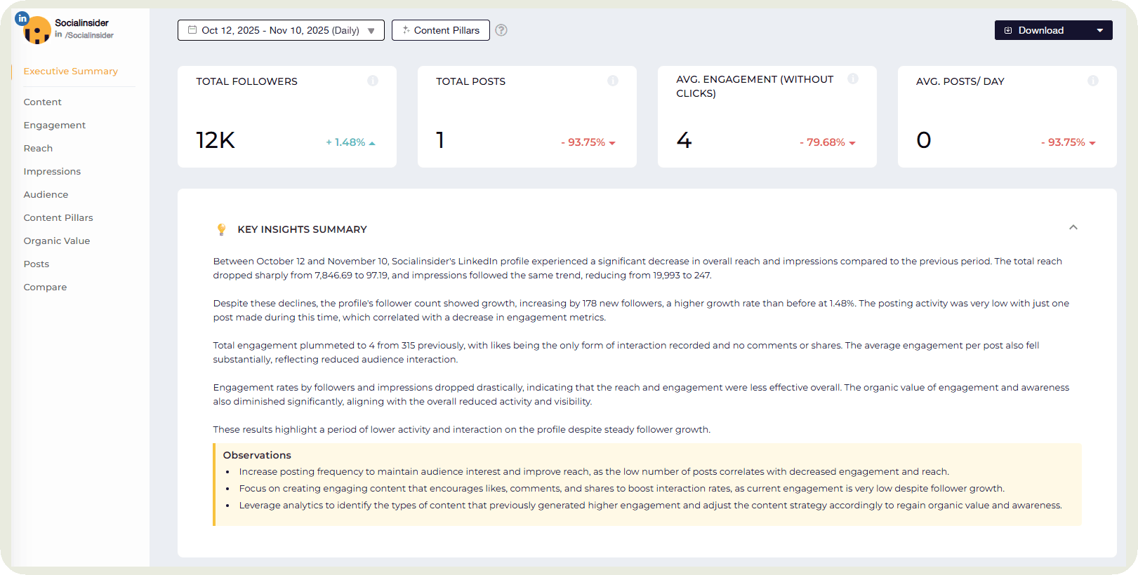 SocialInsider is a comprehensive LinkedIn analytics tool providing in-depth insights to optimize performance. It helps you track essential metrics such as page views, follower growth, post impressions, engagement, clicks and reactions, giving you a streamlined view of how your content is performing over time.