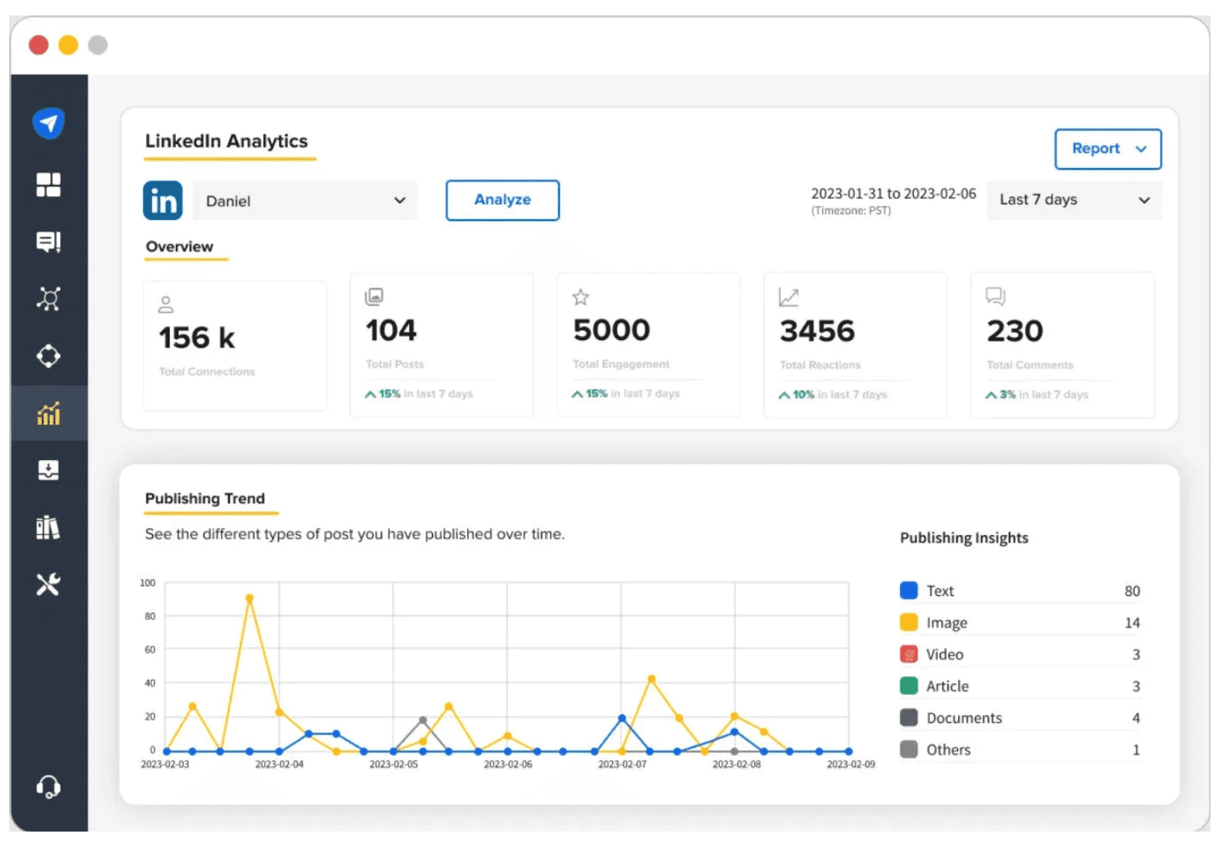 SocialPilot is a LinkedIn analytics and management platform built for marketers, agencies and SMBs that want reliable reporting without complex setup. It allows you to track performance across LinkedIn profiles and Company pages, monitor engagement trends, long-term patterns, and content effectiveness.