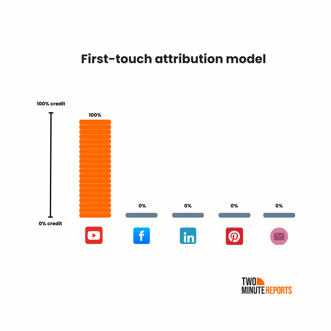 - First-touch attribution gives all the credit to the first interaction,