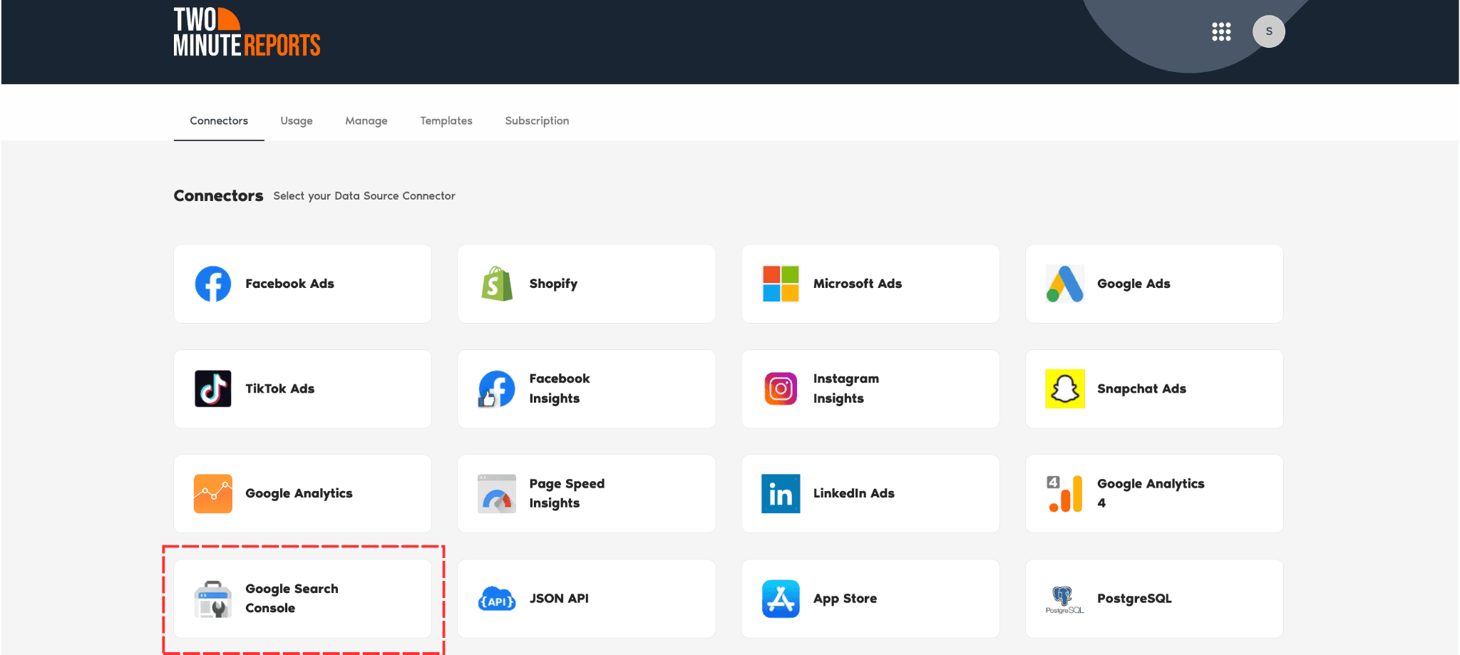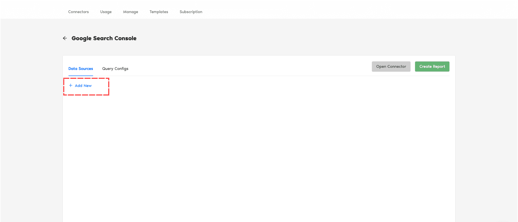 - From the connectors page, choose the relevant data source connector. Click “Google Search Console” and it will take you to the Google Search Console dashboard.
