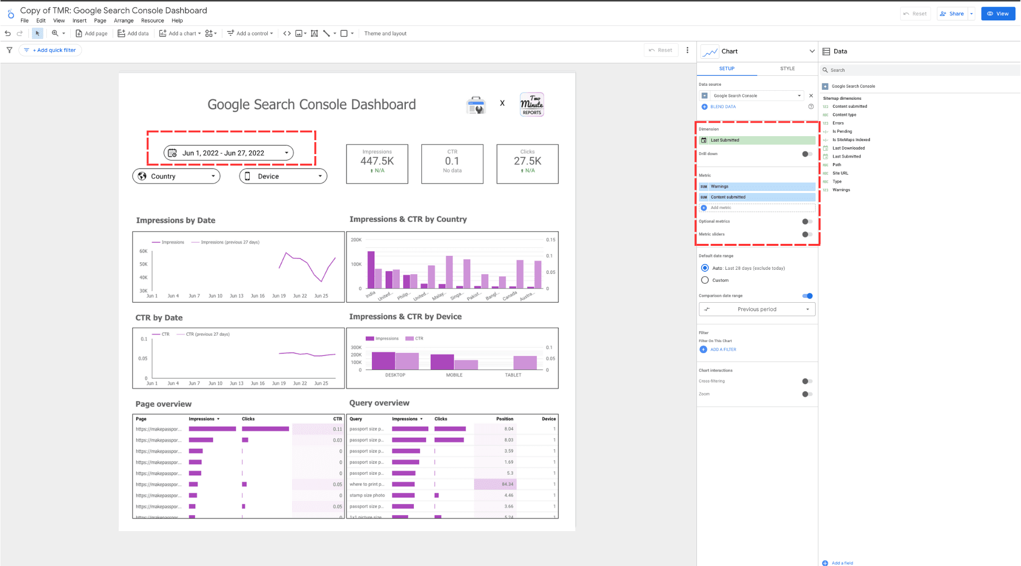 Whether you want to track your important SEO metrics or identify search patterns, you can connect your GSC account with Looker Studio to set up real-time reporting dashboards. You can dive deep into each SEO metric, such as clicks, CTR, organic traffic, keyword rankings, queries, top-ranking pages, etc., understand how they dynamically change over a given time, and spot the areas for improvement.