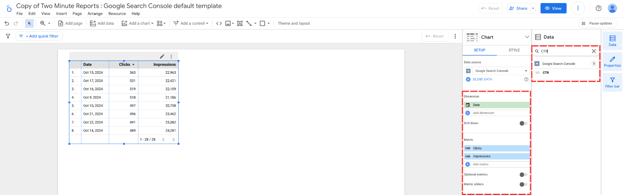 - With the table/chart selected, select the Google Search Console metrics you want to include in your analytics report. Explore the categories in the “Metrics” dropdown menu, like CTR, clicks, impressions, and position to add them to your GSC report.