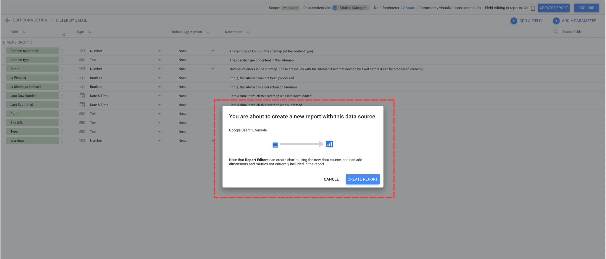 - The next window shows all the available Google Search Console metrics and dimensions, to be included in your Looker Studio report. You can either modify the metrics or click the Create Report button at the top right corner.