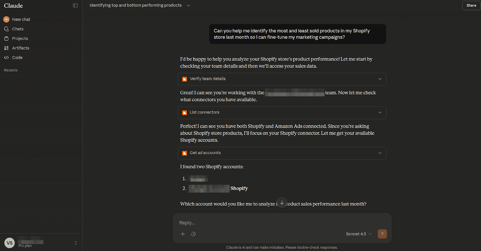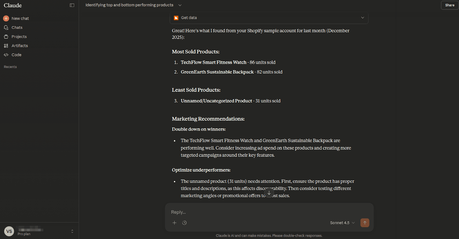 Prompt: “Can you help me identify the most and least sold products in my Shopify store last month?”