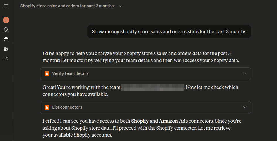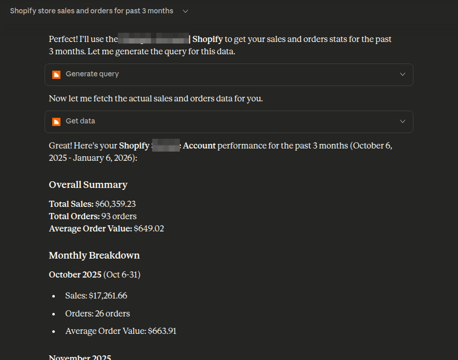 Prompt: “Show me my Shopify store sales and orders for the past 3 months.”
