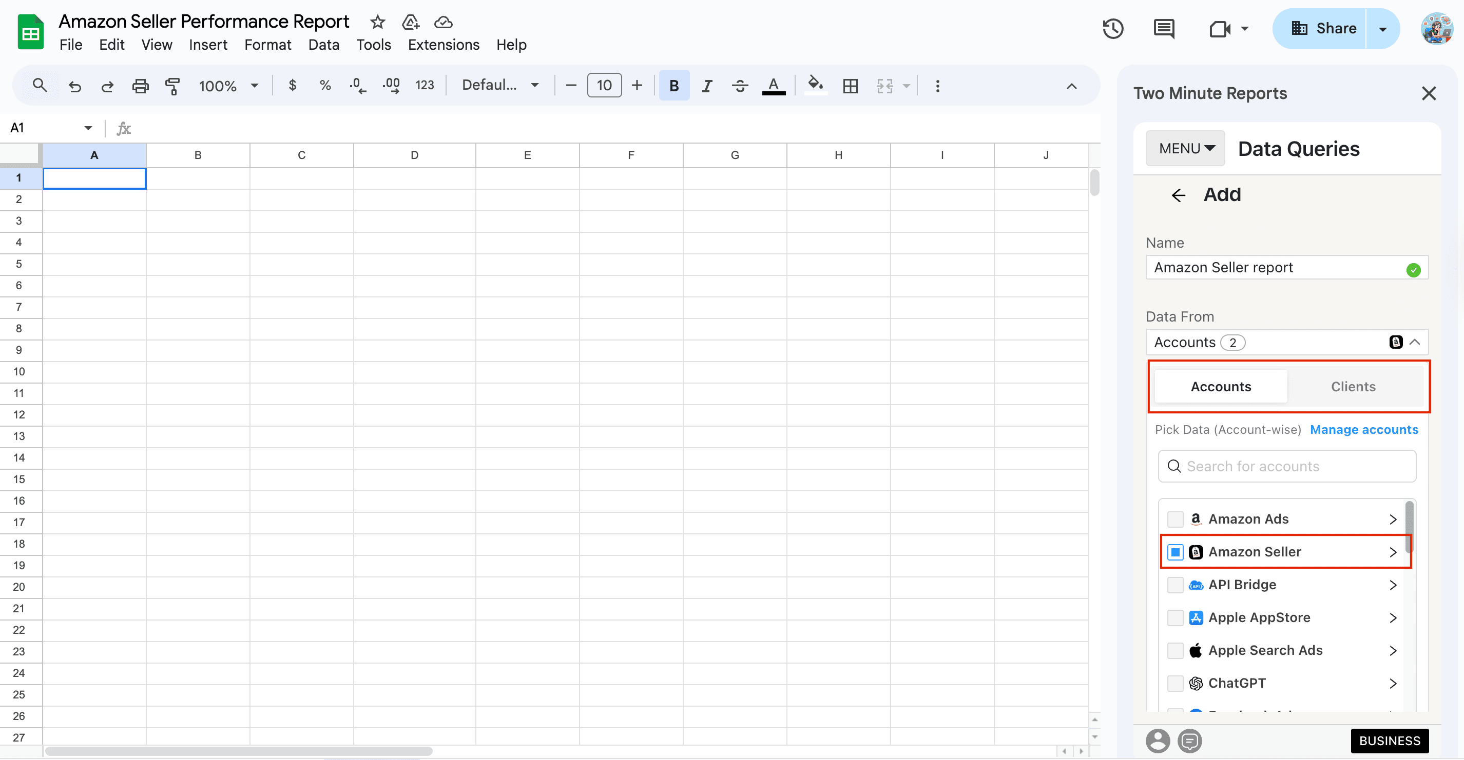 2. Launch the Two Minute Reports add-on in your spreadsheet. Next, connect your Amazon Seller accounts to Google Sheets to import your seller accounts to Google Sheets.