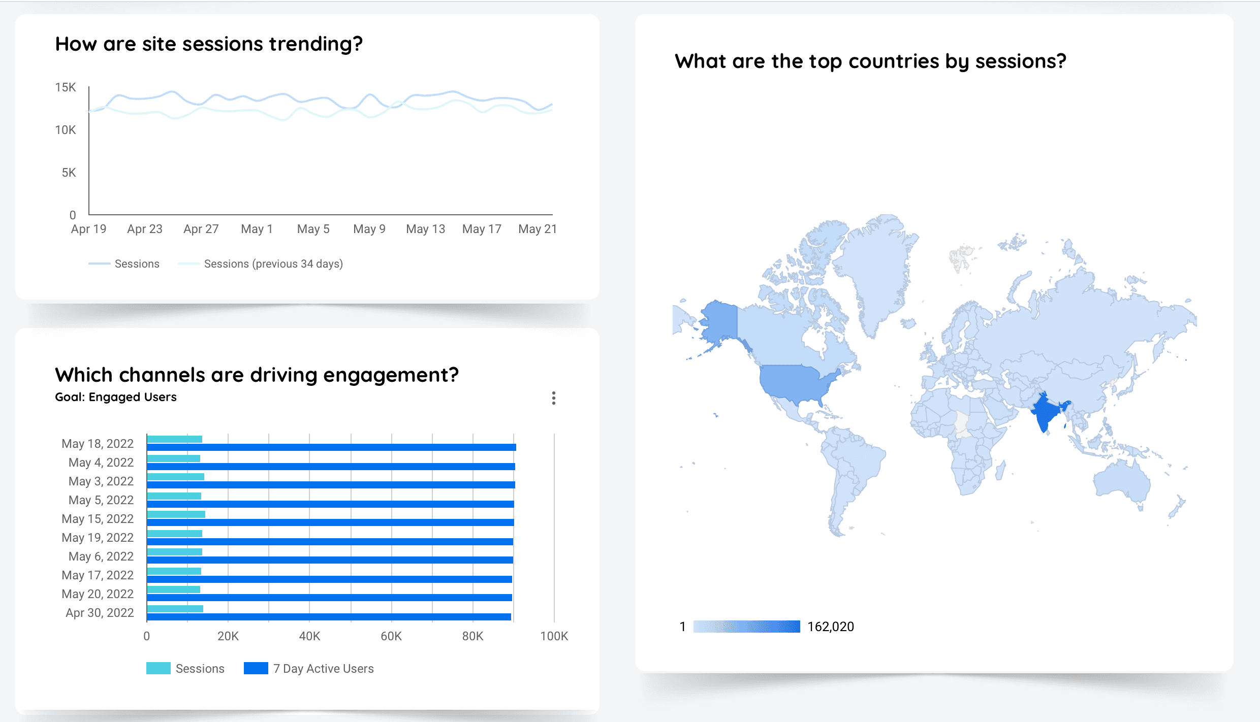 - Website traffic: Monitor overall website visits and session trends over time.