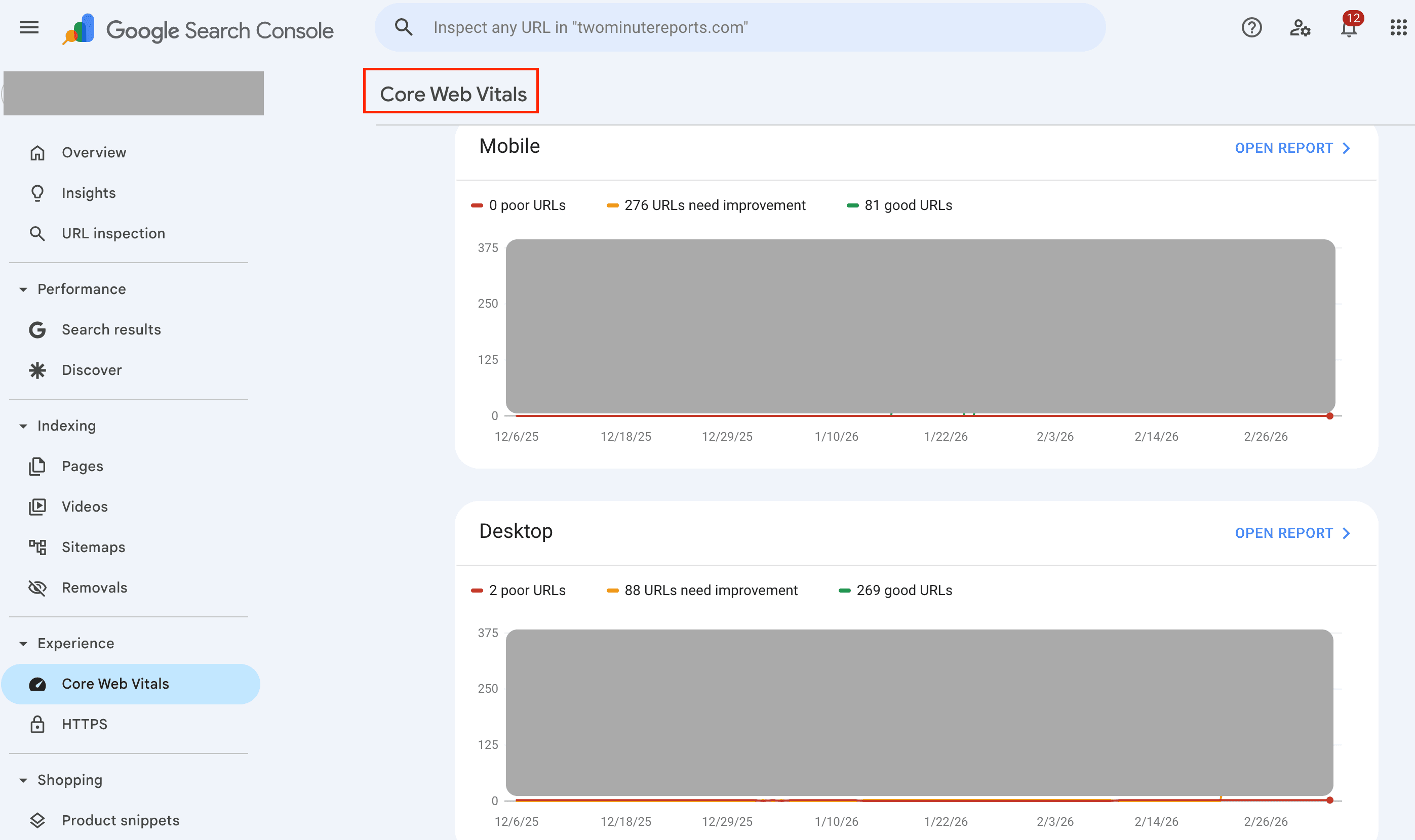 - Core Web Vitals: LCP (loading), INP (interactivity), and CLS (visual stability), all available in Search Console