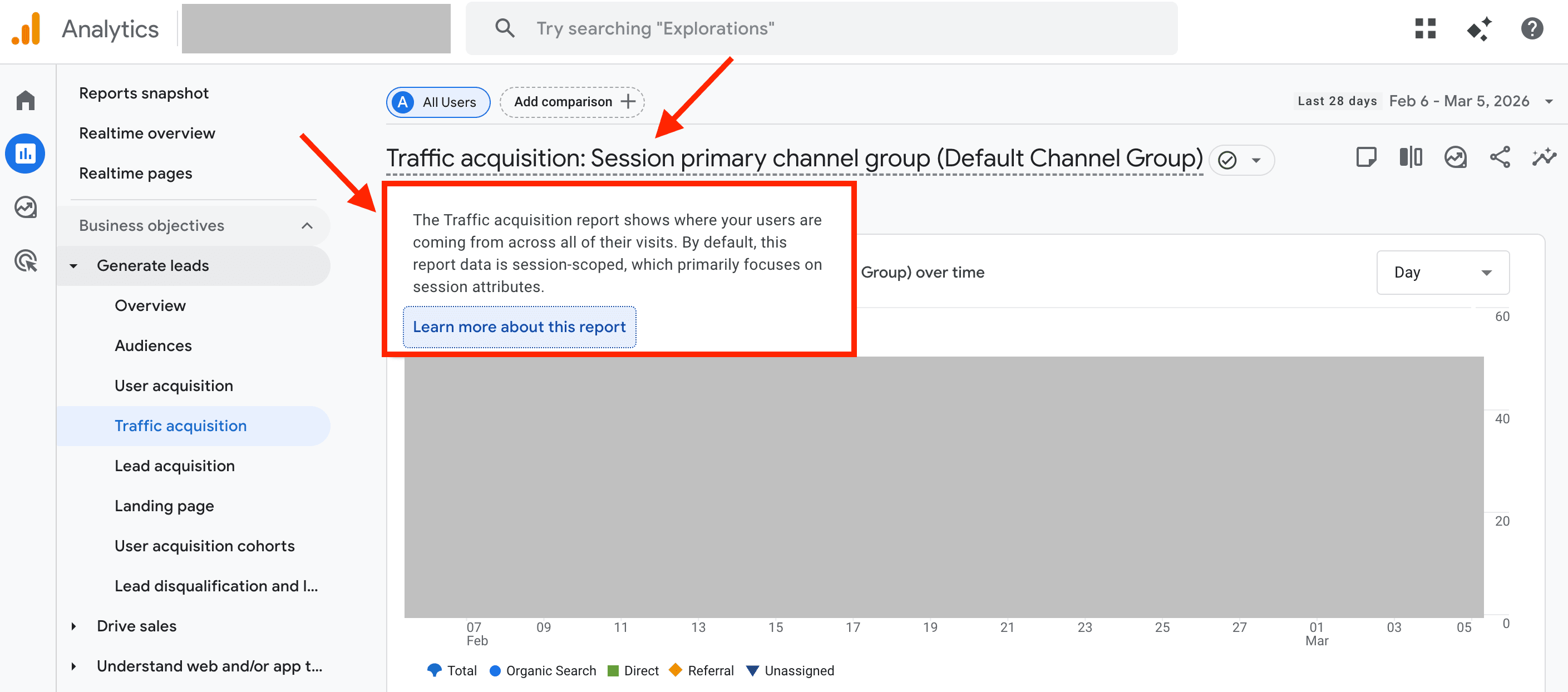 Track in GA4 under Traffic Acquisition, filtered by organic search.