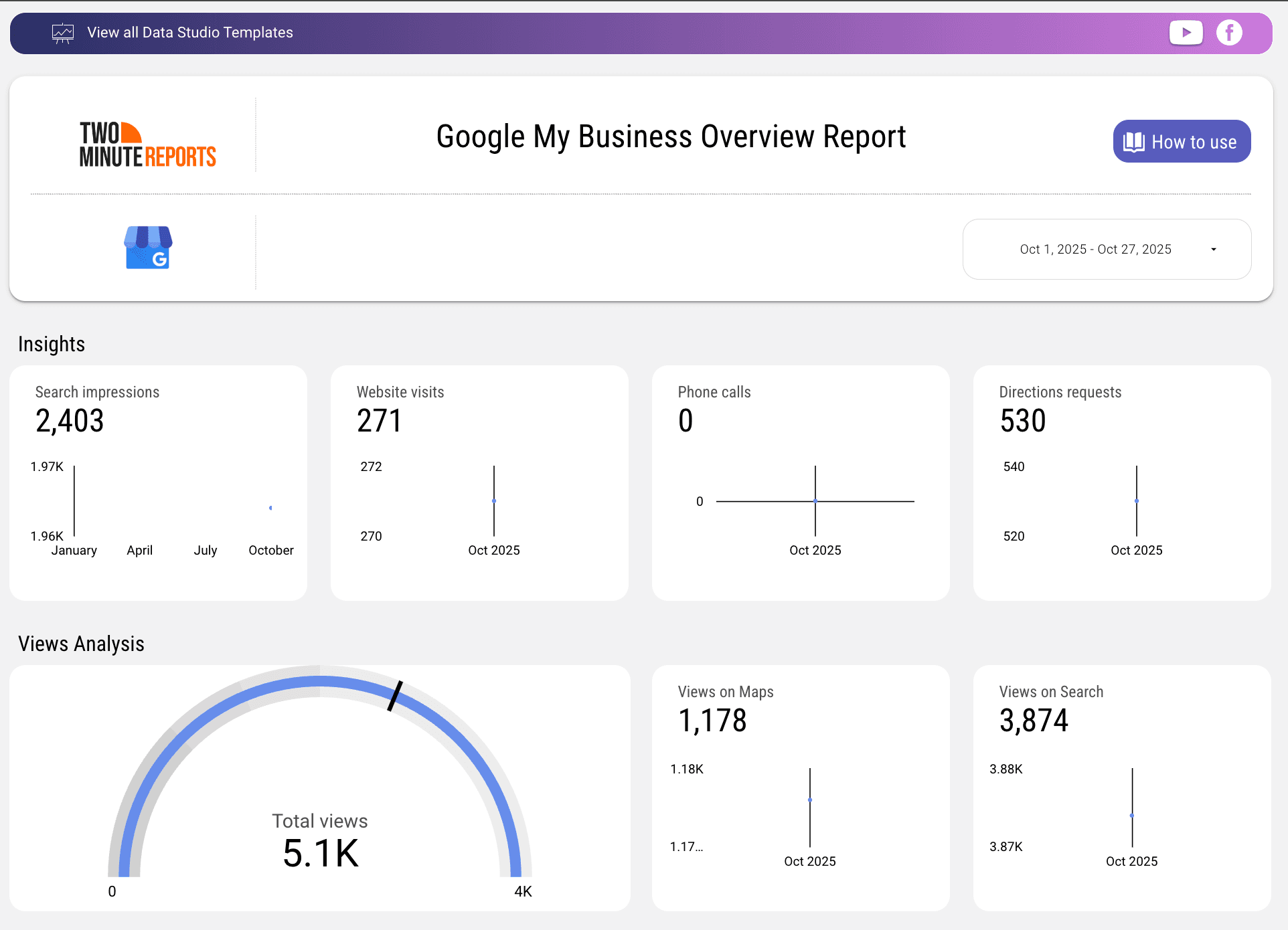 Optimize your GMB profile performance in real-time with our customizable Google My Business template. Track key metrics such as search impressions, website visits, views on maps vs search, total views over time and top search terms based on the location in a single dashboard.