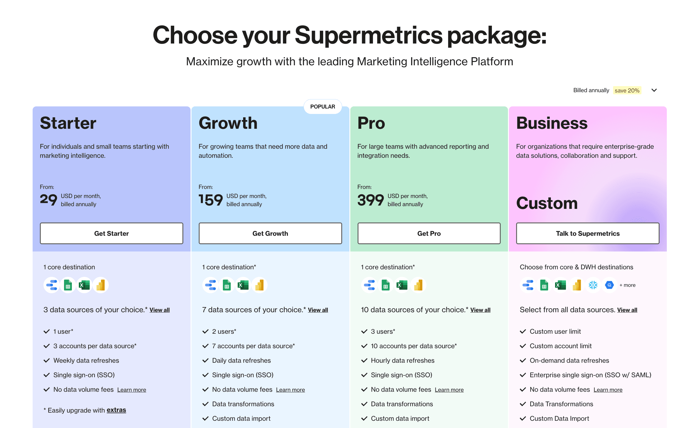 Supermetrics offers four different pricing plans – Starter, Growth, Pro, and Business, depending on the following factors: