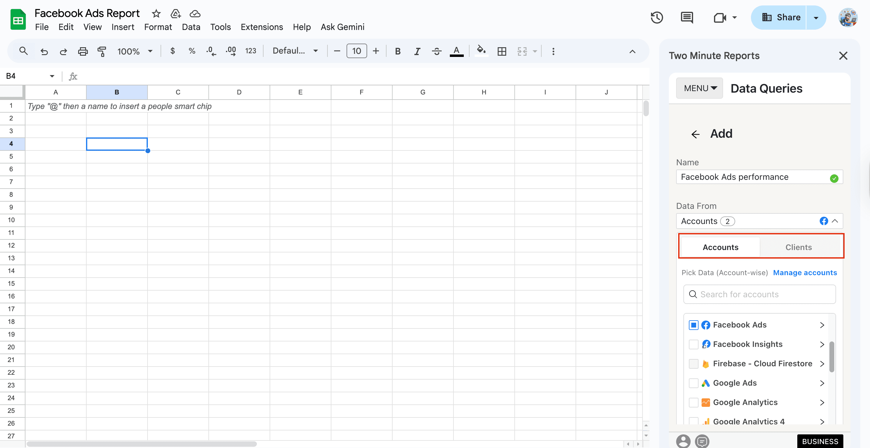 Method 1: Connecting Facebook Ads to Google Sheets using the sidebar