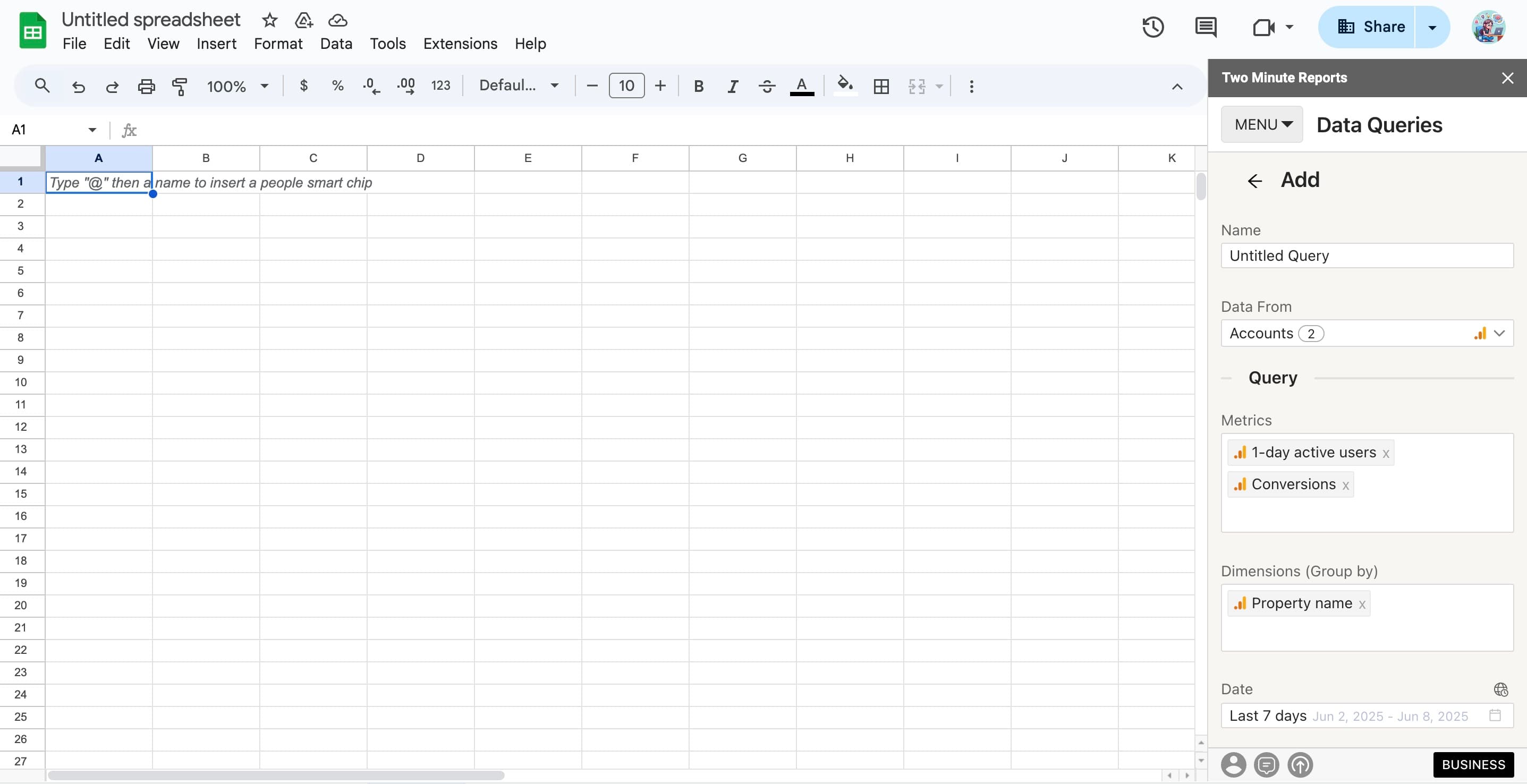 With Two Minute Reports, an intuitive Google Sheets add-on, you can create actionable GA4 reports without hassle. Here is a step-by-step guide to getting Google Analytics 4 data to your Google Sheets.