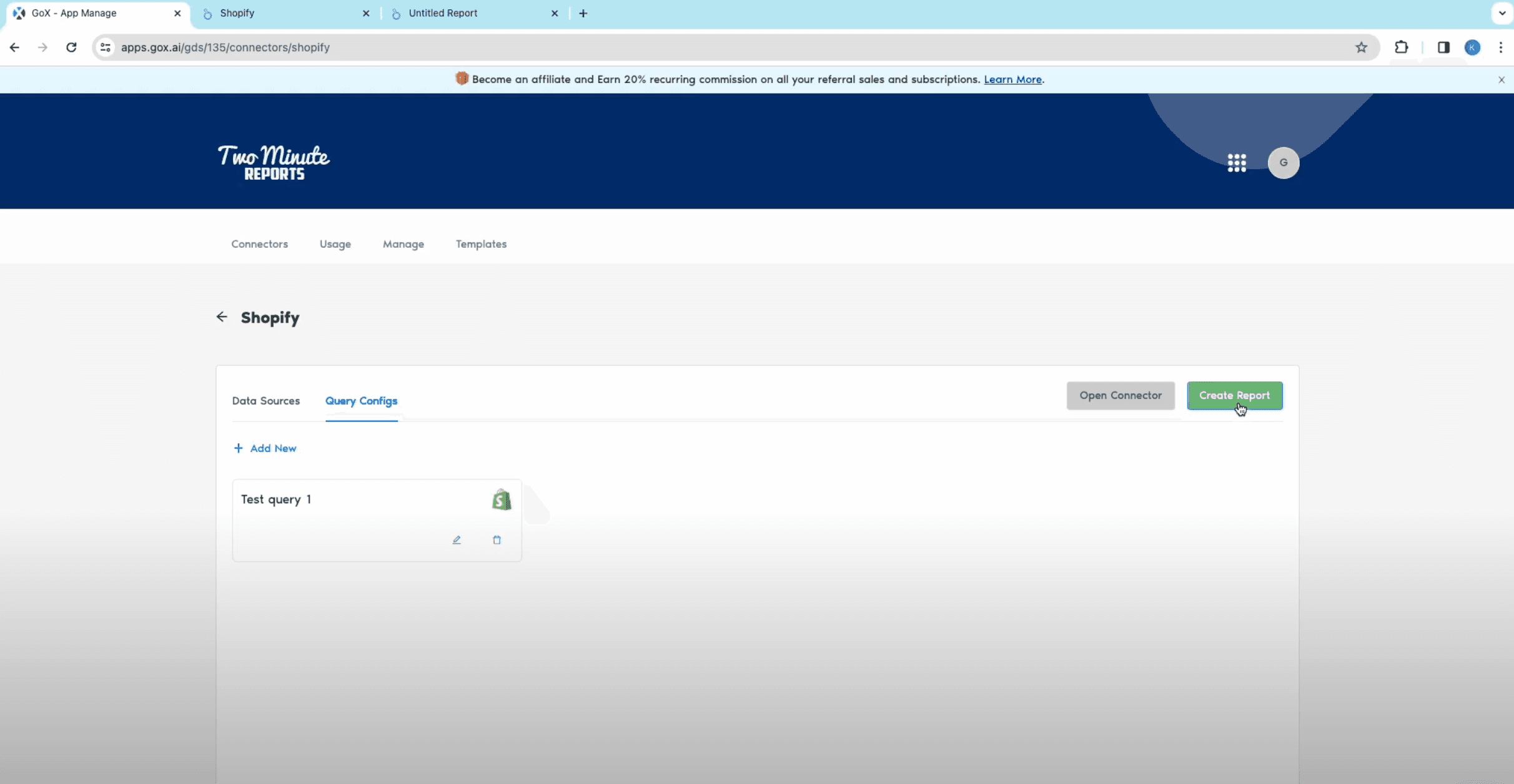 - Once you have successfully connected to your Shopify store, move to the Query configs tab and click on Add New.
