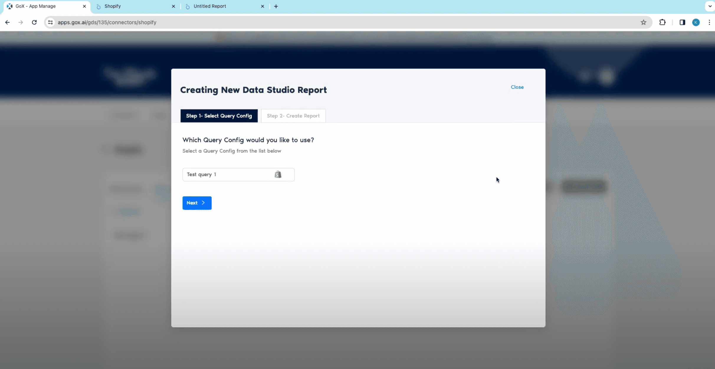 - Select Shopify-> add connection details-> save and authorize. In Query Configs, add a configuration and set all your Data Source and then click on Next.